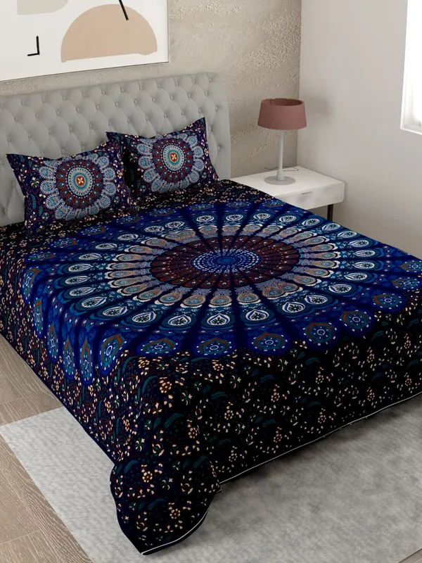 180 TC Blue 100% Cotton Badmeri Printed King Size Bedsheet With 2 Pillow Co..More