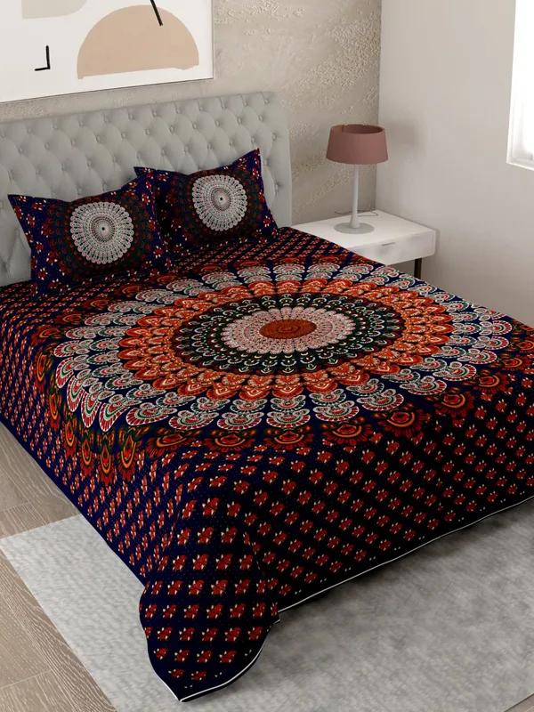 180 TC Multi 100% Cotton Badmeri Printed King Size Bedsheet With 2 Pillow C..More