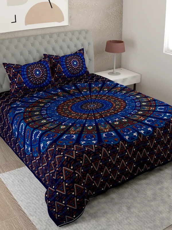 Blue 100% Cotton Badmeri Printed King Size Bedsheet With 2 Pillow Cover(D-1..More