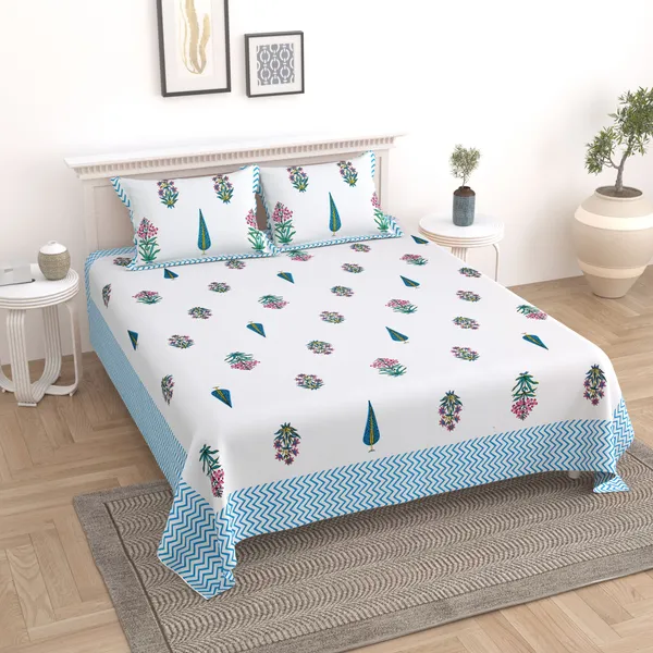 Blue 100% Cotton King Size Bedsheet With 2 Pillow Cover